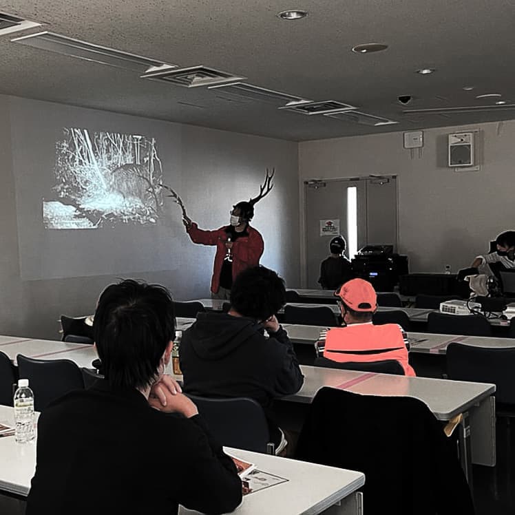 演者が鹿角ヘルメットをかぶり,鹿角を指示棒にして講演しています。
