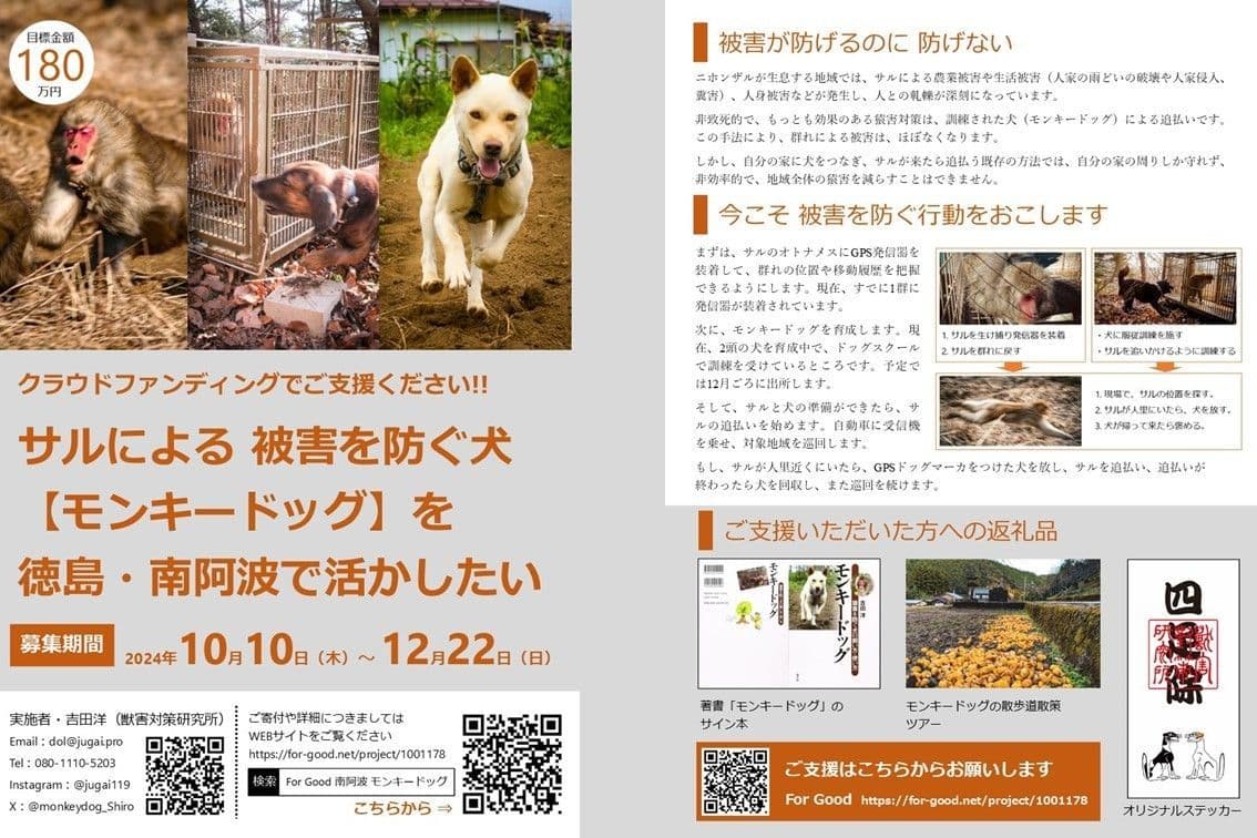 クラファン「サルによる被害を防ぐ犬『モンキードッグ』を徳島・南阿波で活かしたい」に挑戦します クラウドファンディングを、10月10日から開始します。