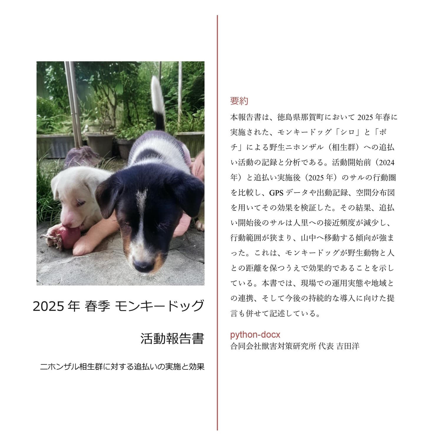 2025年春に徳島県那賀町で実施したモンキードッグ(追払い犬)による野生ニホンザルの追払い活動の成果をまとめた報告書を公開いたしました。 本報告書では、サルの行動圏や出没傾向の変化を、GPSデータや地図解析をもとに可視化し、地域における獣害対策の効果と課題について考察しています。 表紙には、活動に参加した犬たち「シロ」と「ポチ」の幼少期の写真を使用しています。彼らの活躍が、人と野生動物が共に暮らす未来へとつながる第一歩となることを願っています。