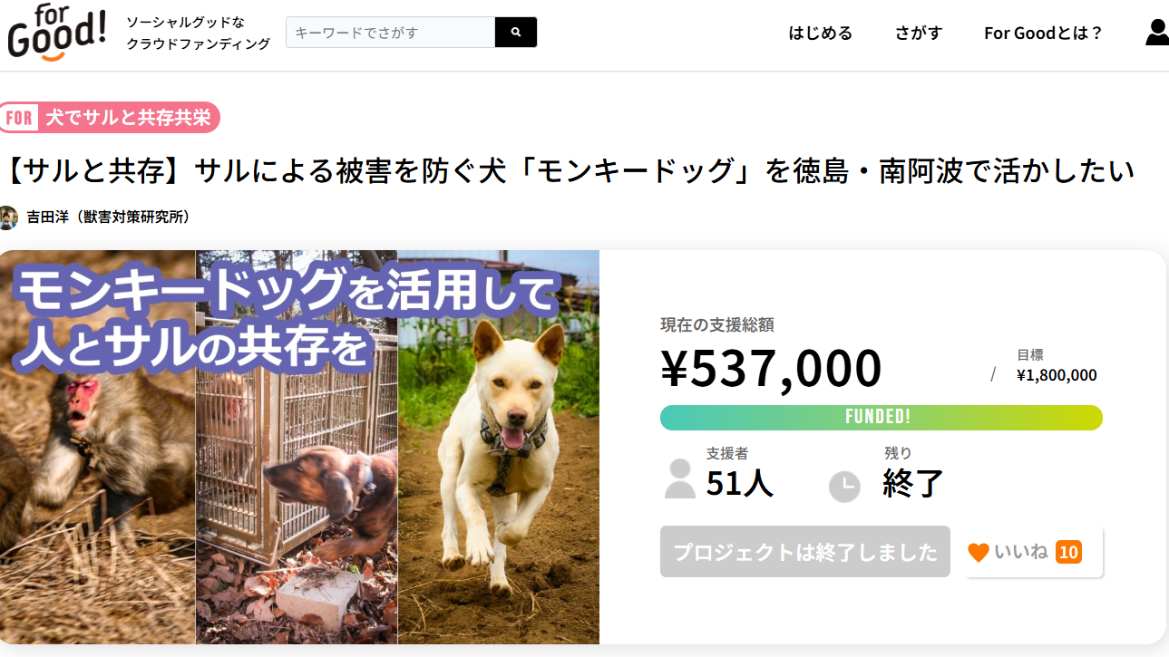 | 2024.12.23 | クラウドファンディング「サルによる被害を防ぐ犬『モンキードッグ』を徳島・南阿波で活かしたい」が、2024年12月20日をもって終了しました。 |